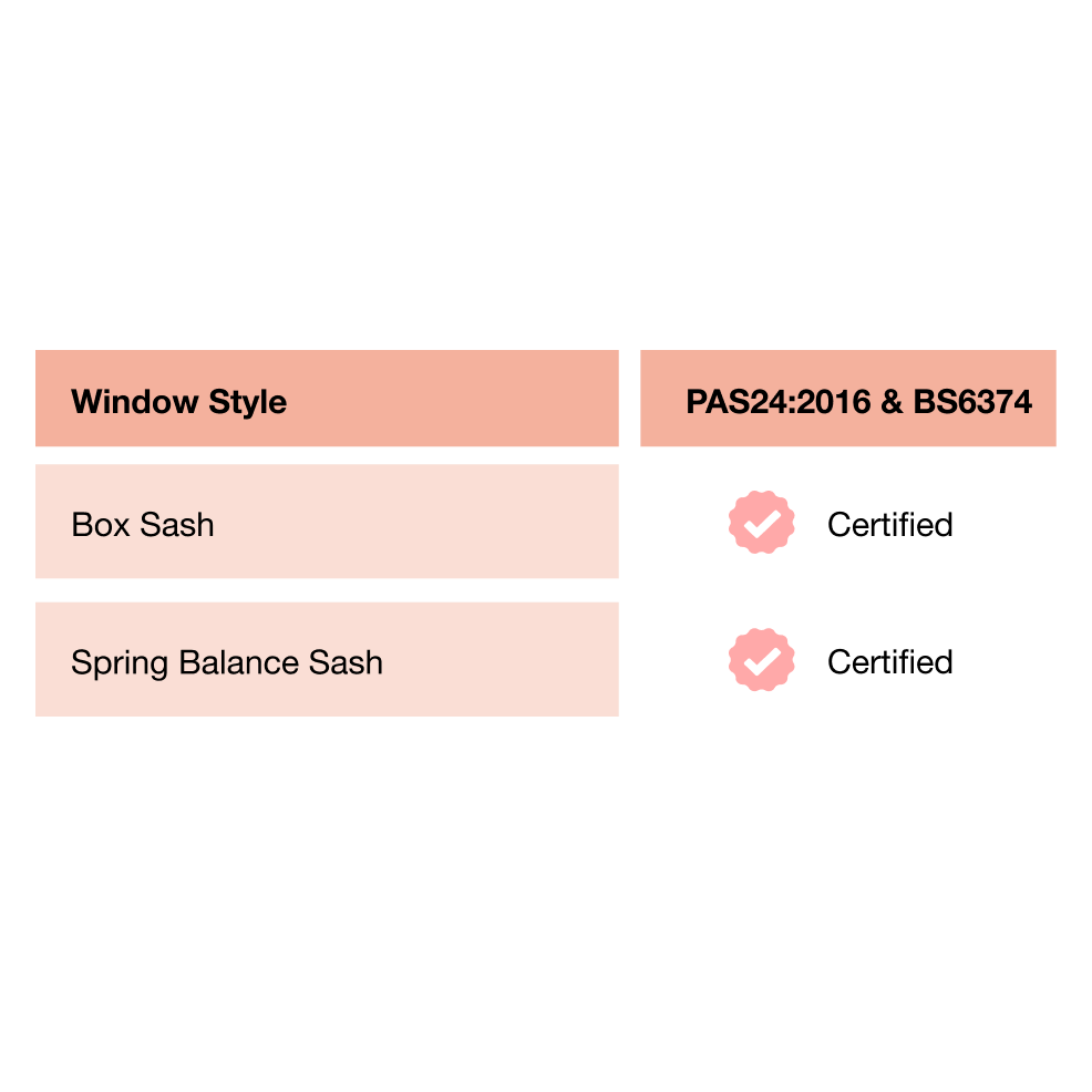 Come in either Box Sash (with pulley mechanism) or Spiral Balance Sash (with spiral balance), all certified to PAS24:2016 & BS6374.